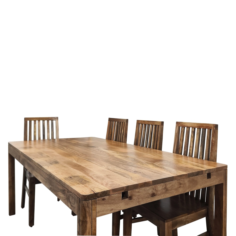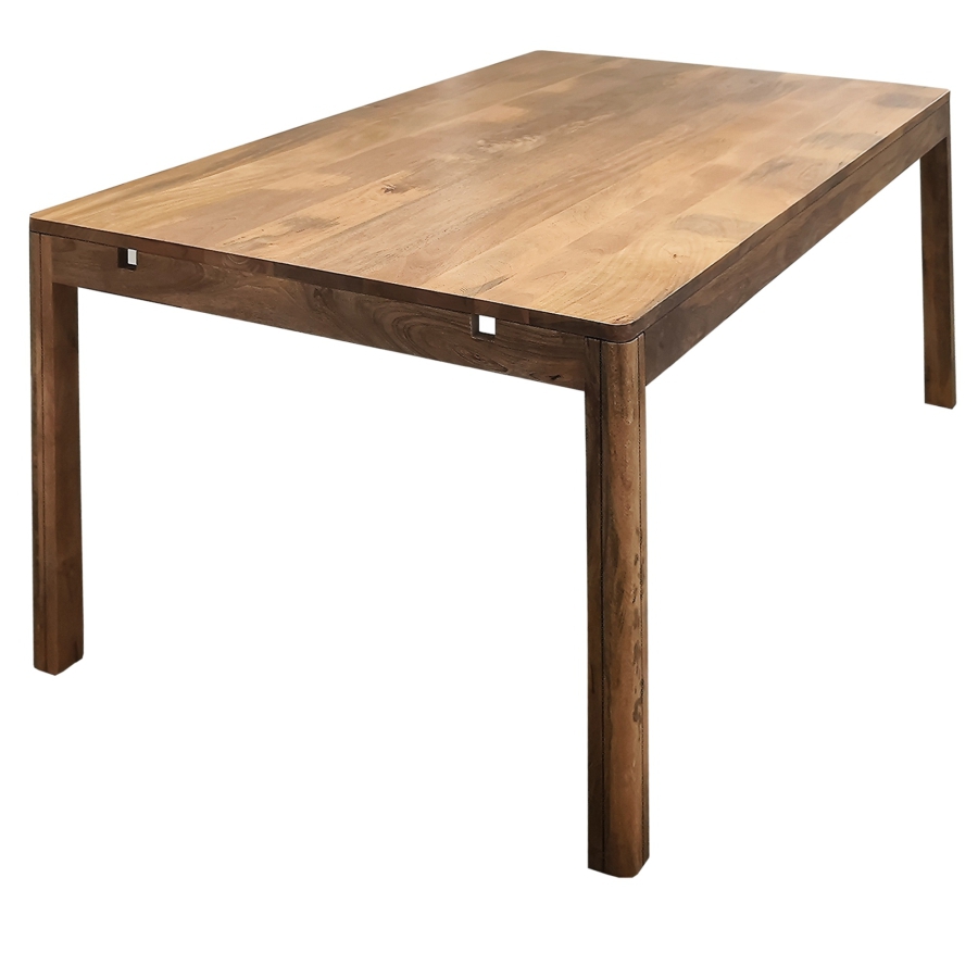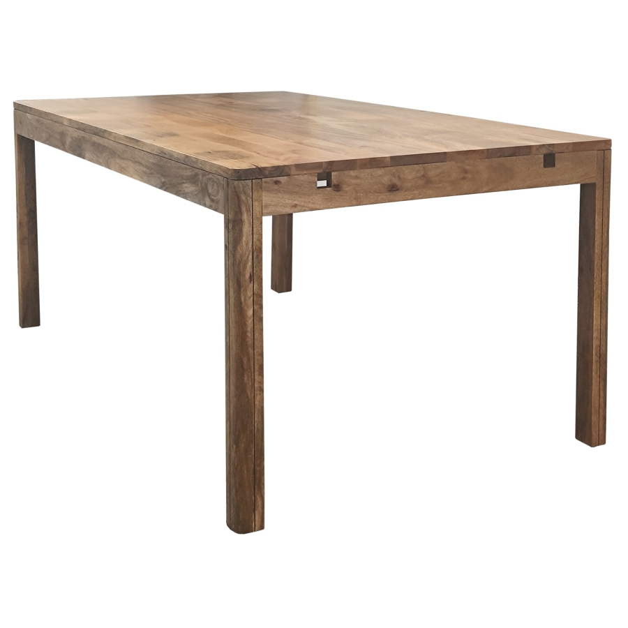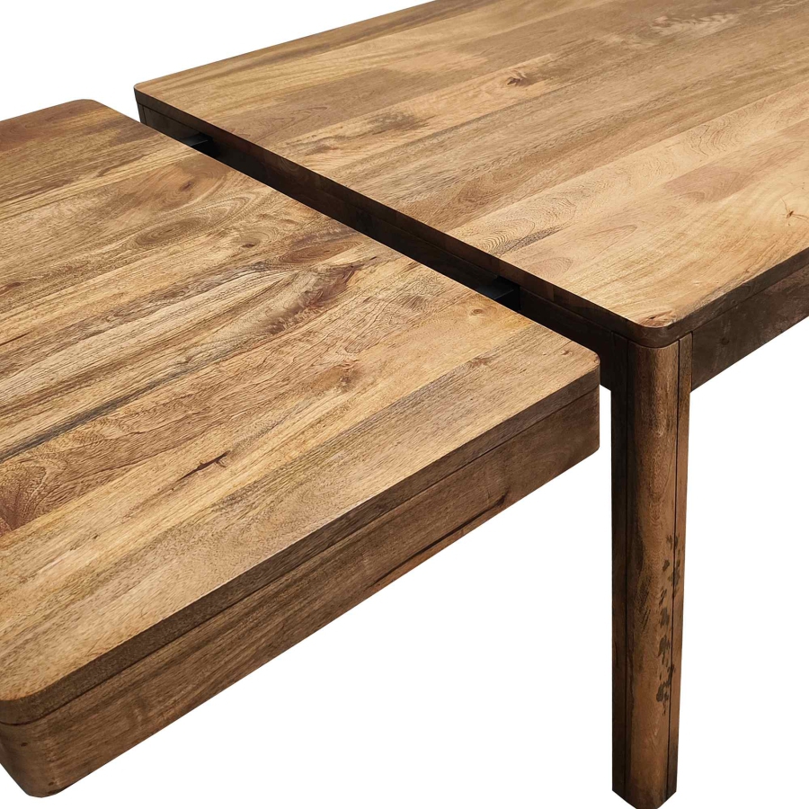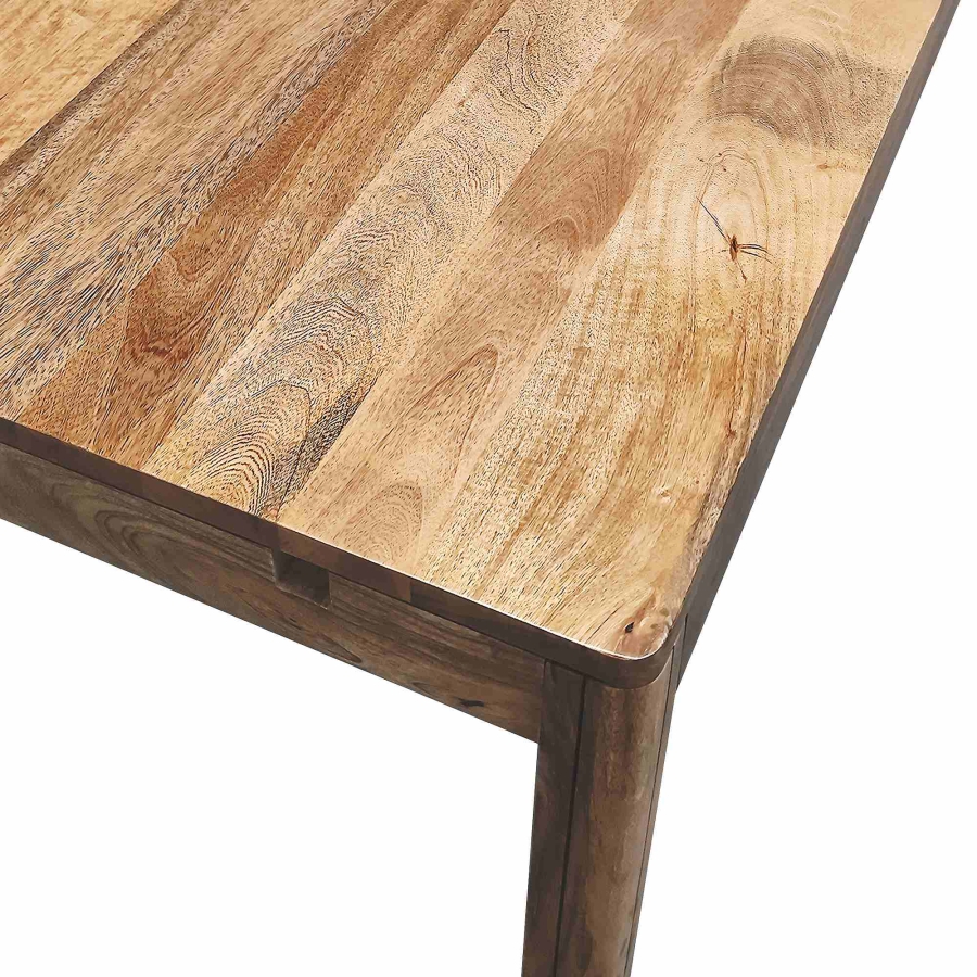 Die abgerundeten Ecken der Tischplatte und der Verlängerungen sowie die abgerundeten, hochkant stehenden Beine verleihen dem Tisch eine dezente Eleganz und betonen gleichzeitig seinen soliden Charakter. Tischplatte und Verlängerungen sind mit einer Schutzlackierung versehen, die nicht nur die Schönheit des natürlichen Mangoholzes hervorhebt, sondern es auch vor Beschädigungen schützt.