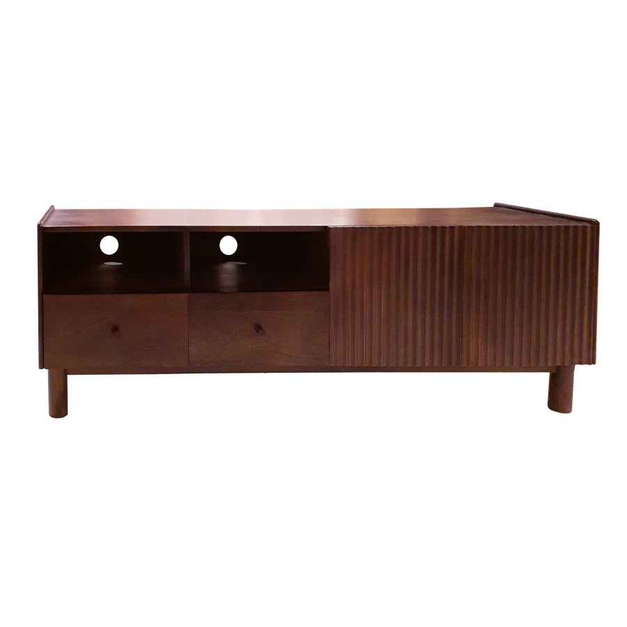 Dieser elegante TV-Schrank aus massivem Akazienholz in der Ebenholz-Farbe vereint zeitloses Design mit Funktionalität. Das Möbelstück mit den Maßen 160x55x39 cm zeichnet sich durch stilvolle, vertikale Rillen an den Türfronten aus, die ihm einen einzigartigen Charakter und modernen Ausdruck verleihen.