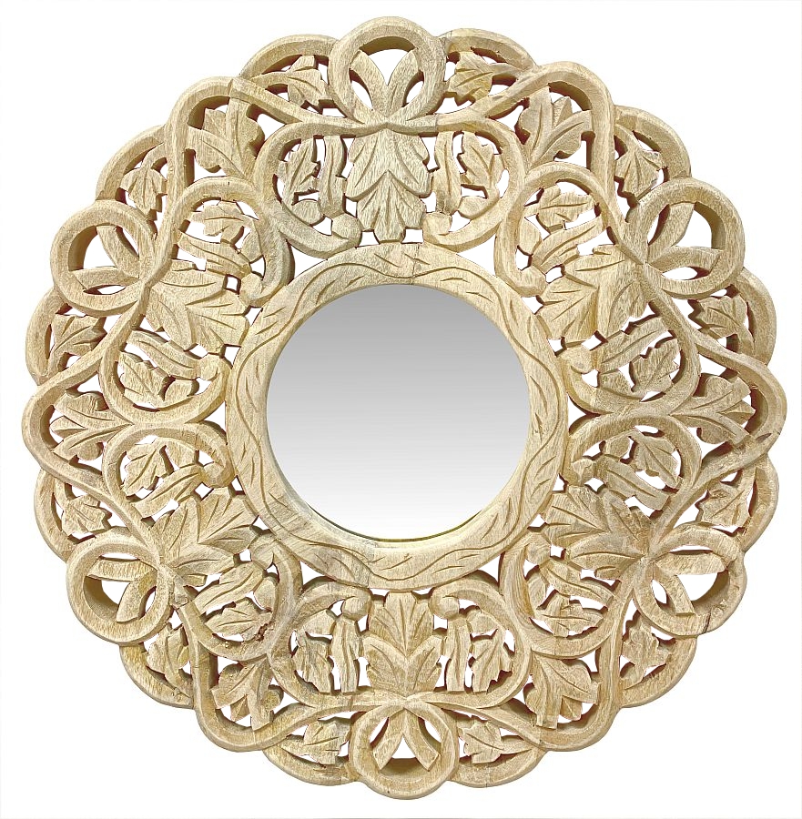 Der elegante Pflanzenmotivspiegel ist eine großartige Ergänzung für jeden Raum. Die handgeschnitzten Details sorgen für einen einzigartigen visuellen Effekt und machen die Dekoration unverwechselbar. Die Wärme des Mangoholzes, aus dem der Rahmen besteht, verleiht dem Interieur Gemütlichkeit und eine besondere Atmosphäre. Auf der Rückseite des Rahmens befindet sich ein Griff zum Aufhängen des Spiegels an der Wand.
