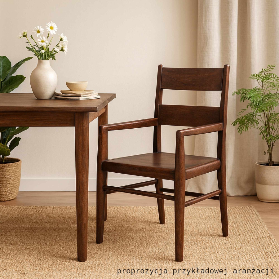 Der moderne und zugleich klassische Stuhl KARLO besteht aus massivem Akazienholz und ist mit Beize in warmem WALNUT-Farbton sowie satiniertem Lack veredelt. Die schlichte, elegante Form in Kombination mit bequemen Armlehnen macht den Stuhl sowohl für Esszimmer als auch Wohnzimmer ideal. Er passt perfekt zu großen, massiven Tischen und bildet ein harmonisches, stilvolles Ensemble.