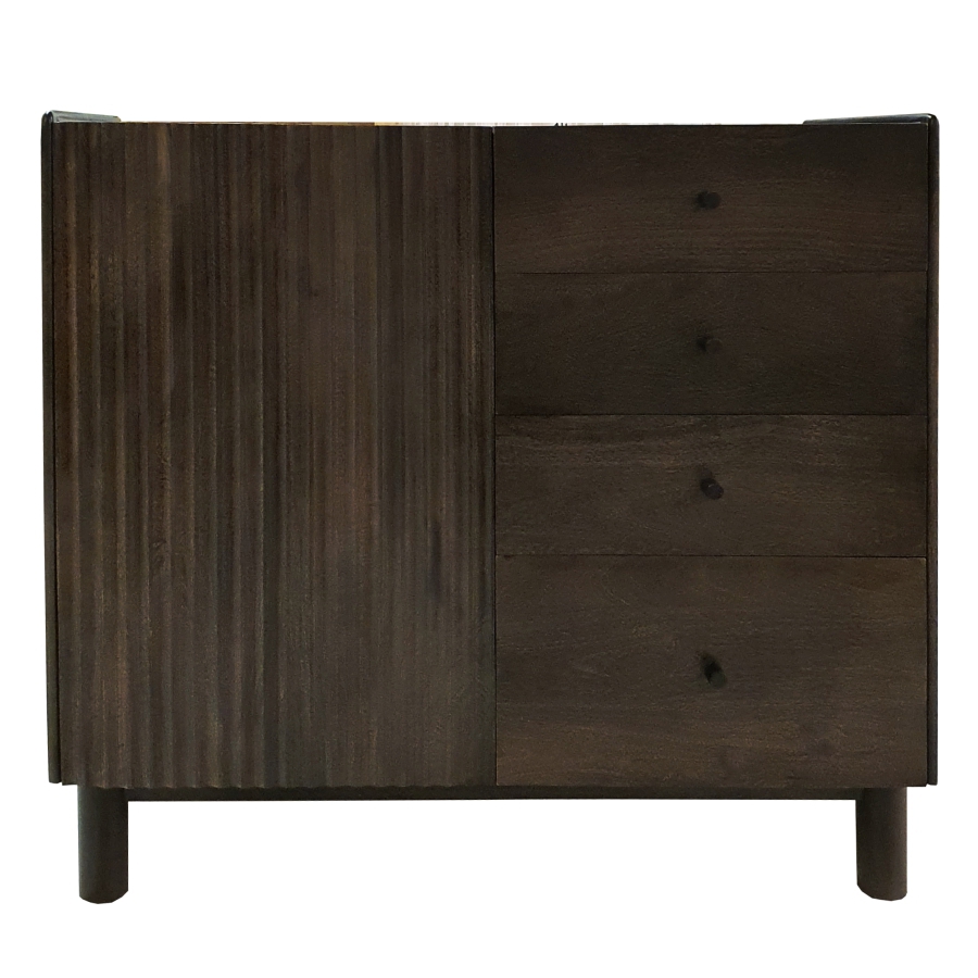 Das Möbelstück zeichnet sich durch eine einfache, minimalistische Form, praktische Griffe an den Schubladen und modernes Design aus, während das natürliche Material zusätzliche Eleganz verleiht. Die gesamte Oberfläche ist mit satiniertem Lack überzogen, der die Schönheit des Mangoholzes betont und zugleich die tägliche Pflege erleichtert.