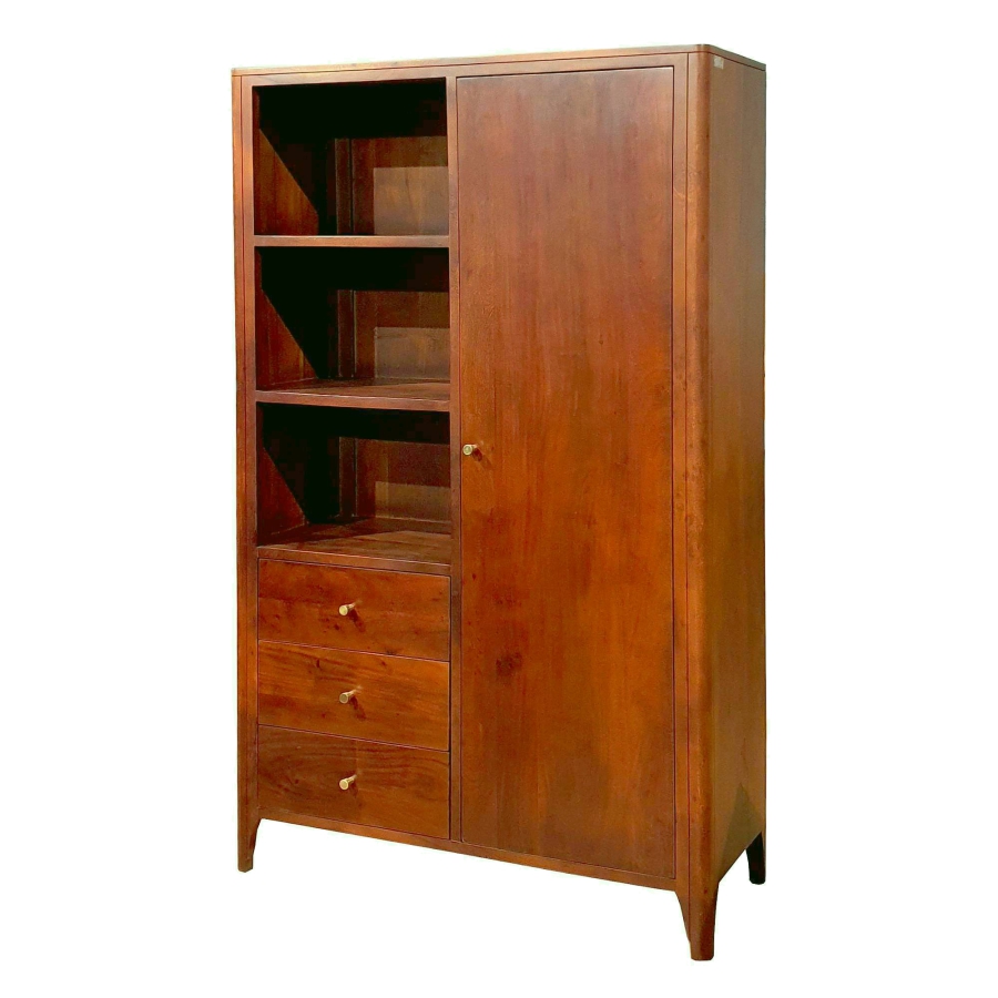 Die rechte Seite des Regals ist mit einem geräumigen, geschlossenen Schrank mit mehreren praktischen Einlegeböden ausgestattet, der eine ordentliche und diskrete Aufbewahrung von Gegenständen ermöglicht. Die linke Seite beeindruckt mit einer offenen Gestaltung — die oberen Regalböden eignen sich hervorragend zur Präsentation von Büchern oder dekorativen Elementen. Darunter befinden sich drei elegante Holzschubladen, die mit dezenten, goldfarbenen Metallknöpfen veredelt sind und dem Möbelstück einen besonderen, edlen Charakter verleihen.