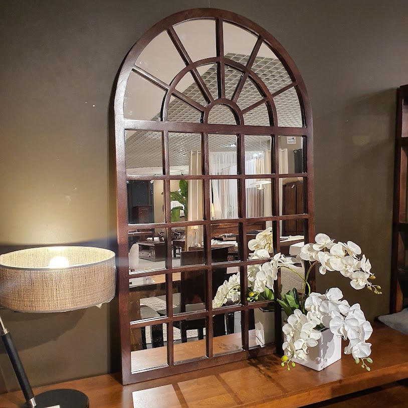 Ein eleganter Spiegel im Fensterstil, der dem Interieur einen besonderen Charakter verleiht und den Raum optisch vergrößert. Der Rahmen wurde aus hochwertigem Mangoholz gefertigt und in edlem Ebenholz-Farbton veredelt, was die natürliche Schönheit und zeitlose Eleganz unterstreicht.