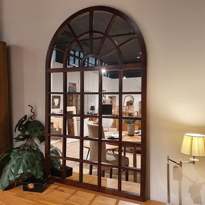 Der Spiegel FLORENZ ist eine schlichte und klassische Dekoration in einem Rahmen aus natürlichem Akazienholz in elegantem Braunton, die an ein großes, offenes Fenster erinnert. Der halbrunde Spiegel mit strahlenförmigen Sprossen verleiht ihm einen besonderen, dekorativen Charakter. Durch die große Glasfläche bringt der Spiegel mehr Licht ins Zimmer und vergrößert optisch Wohnzimmer oder Esszimmer.