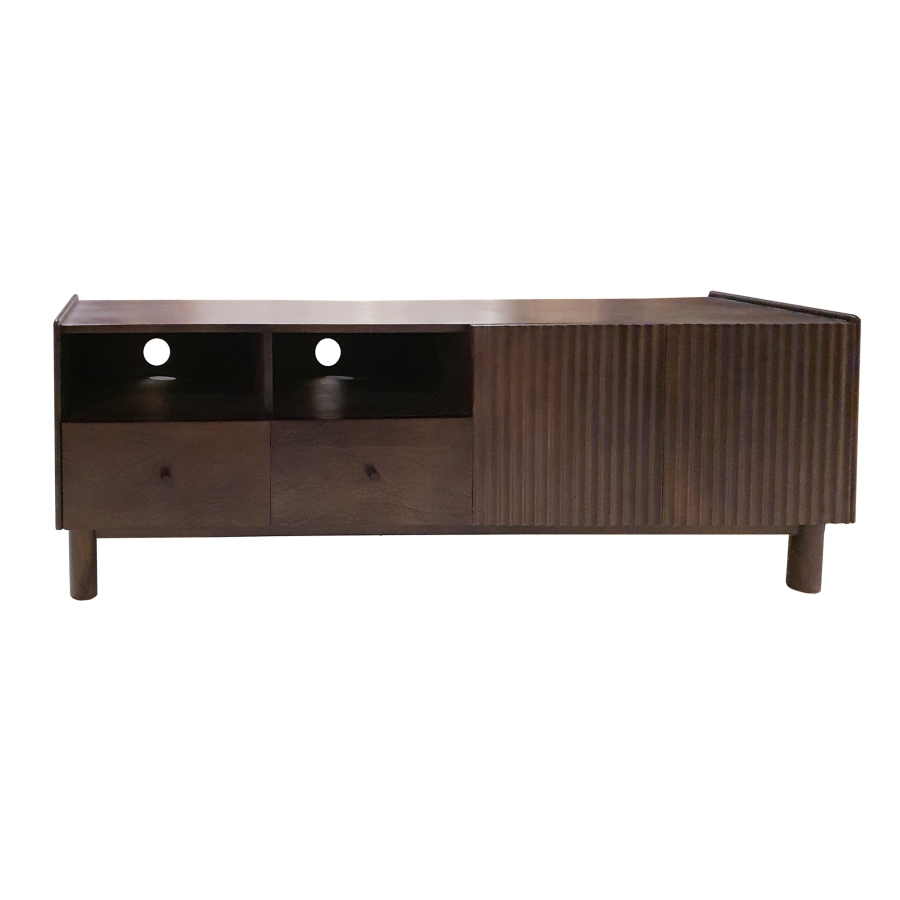 Der elegante TV-Schrank aus massivem Mangoholz in warmem Toffi-Farbton verbindet zeitloses Design mit praktischer Funktionalität. Das Möbelstück mit den Maßen 160x55x39 cm zieht die Blicke durch stilvolle, vertikale Fräsungen an den Türen auf sich, die ihm einen modernen und einzigartigen Charakter verleihen.